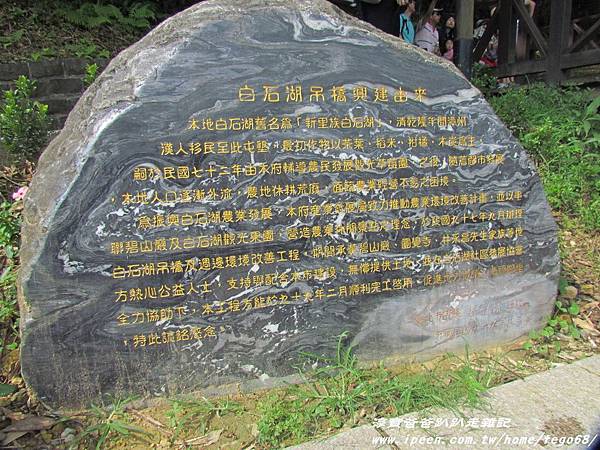 為振興白石湖農業發站,本府產業發展局致力推動農業環境改善計畫,避影串連碧山巖及白石湖觀光果園,營造農業休閒景點之理念,於民國九十七年九月辦理白石湖吊橋及周邊環境改善工程,期間程蒙碧山巖 圓覺寺 林永昌先生家族等地方熱心公益人士,支持與配合本市建設,無償提供土地,並在白石湖社區發展協會全力協助下,本工程方能於九十九年二月順利完工啟用,促進地方繁榮,粽福鄉里,特此誌銘感念。